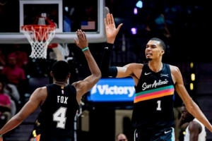 比赛结束后,马刺官推晒出了本场比赛的赢球海报,文班和福克斯登上封面。
